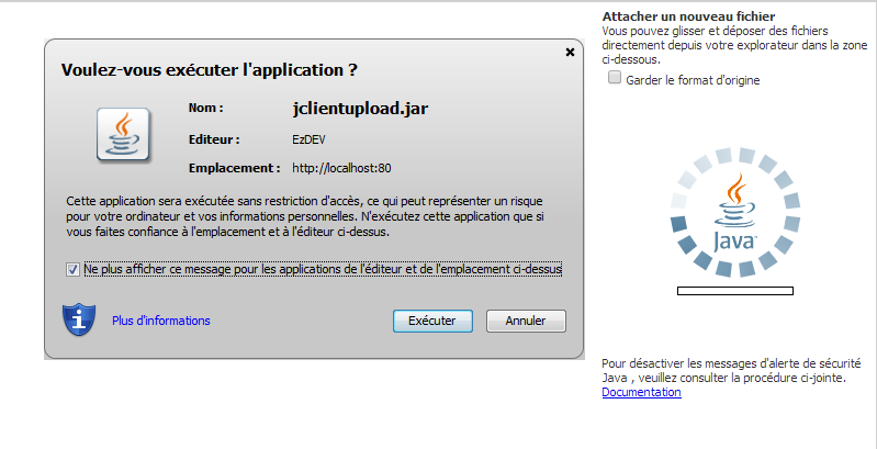 Afin d'accepter de manière permanente l'exécution de l'applet ( ainsi que de tout ceux que nous avons signés ) provenant de cet emplacement (i.e l'URL à partir de laquelle vous accédez à EzGED.) il suffit de cocher la case suivit de la mention “Ne plus afficher ce message pour les applications de l'éditeur et de l'emplacement ci-dessus”.