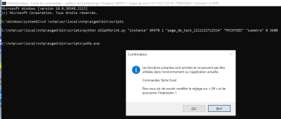 Veuillez noter le “Commandes Tâche Excel”. C'est l'option qu'il va falloir désactiver. Si vous cliquez sur “Oui” l'impression devrait se déclencher.